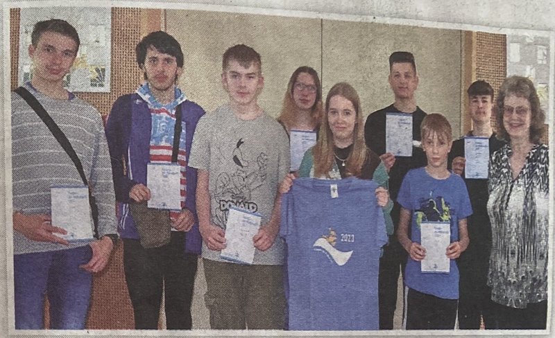 Denn diese besondere Ehrung für alle, die bereits wiederholt zu Schulsiegern gekürt wurden, gibt es abgestuft in Gold, Silber und Bronze - sichtbar aufgedruckt auf einem T-Shirt. Ein solches hatte sich zudem Neuntklässler Luca Lutter erknobelt, und zwar in Bronze. Schulsieger der Klassen 8 bis 10 wurde übrigens Lukas Bremert aus der Zehnten, in Klassenstufe 5 bis 7 Sechstklässler Johannes Demke. Die ausgereichten Preise, Medaillen, Urkunden und T-Shirts sponserte wieder der Förderverein der Schule, vertreten durch Lehrerin Anne Handrich.
