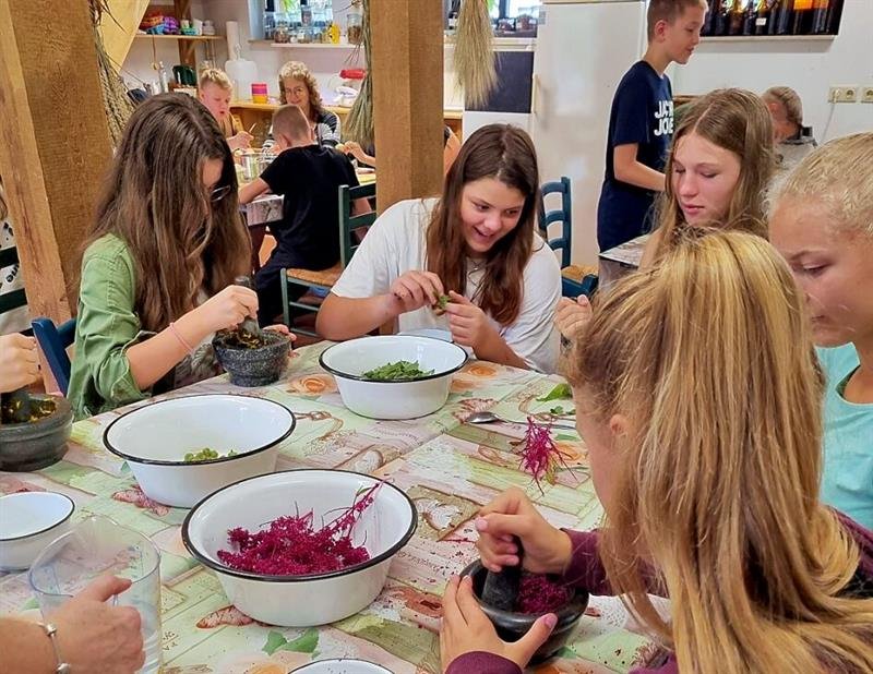 Mit allen Sinnen erleben. Die Schüler nutzten die Augen, ihren Geruchssinn und am Ende sogar den Geschmackssinn. Es wurden Blätter des Haselnussstrauches, Ringelblüten und Amarantblüten gesammelt und mit dem Mörser zerkleinert. Weiterhin wurden Rotkohl und Rote Bete klein geschnitten. Die Schalen der Zwiebel sollten zum Färben genutzt werden. Rotkohl, Rote Bete und Zwiebelschalen wurden ausgekocht. Danach hatten alle erst mal eine Pause auf dem Naturspielplatz des Umweltzentrums.