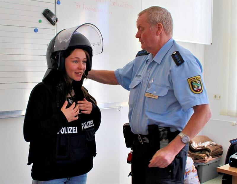 Unterstützung bekommt das Bildungswerk bei der Durchführung des Programmes beispielsweise auch durch die Polizei. Der Regionalbereichsbeamte Holger Sticherling stellte den Siebtklässlern vor, was alles zum Polizeidienst gehört, welche Möglichkeiten es gibt, informierte über die Angebote, sich an der Polizeischule alles anzuschauen, etc. Wer wollte, durfte sich mal die Schutzweste überziehen und den Helm aufsetzen.