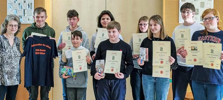 Die besondere Auszeichnung "Mathematiker des Jahres", die diejenigen bekommen, die bereits wiederholt zu den Schulsiegern gehören, erhielten Raphael Genski und Billy Dademasch in Silber. Die ausgereichten Preise, Medaillen, Urkunden und T-Shirts sponserte wieder der Förderverein der Schule, der durch die Lehrerin Anne Handrich vertreten war.